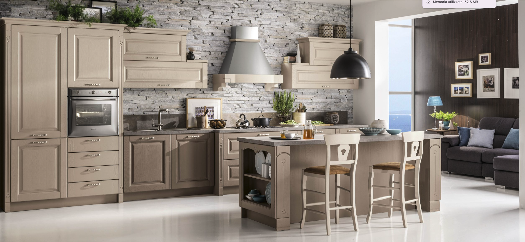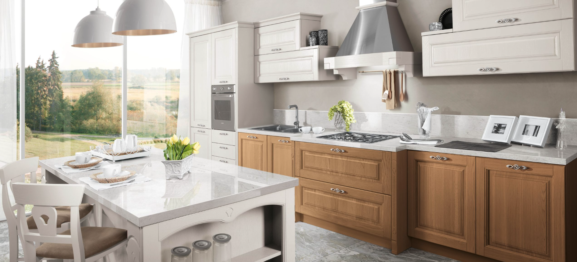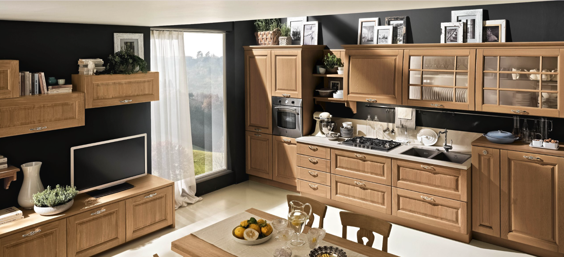 Il richiamo al passato esalta le proposte di arredo, che possono contare su soluzioni altamente ergonomiche e funzionali. Ante vasistas, cassetti, cestoni e ampi piani di lavoro, rendono questo modello capace di soddisfare qualsiasi esigenza.