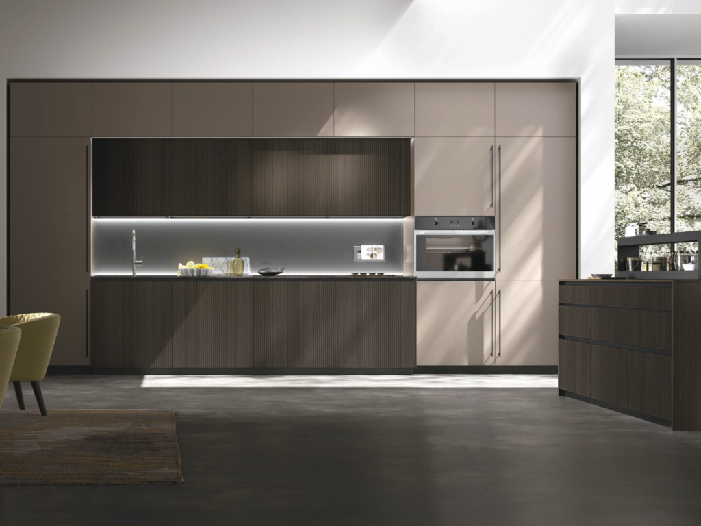 Metropolis ha spazi contenitivi ben organizzati, proposti anche con elementi larghezza 75 cm per accogliere elettrodomestici di ultima generazione come frigo e forno XXL, e moduli suddivisi in tre cassetti di altezze diverse (12 / 24 / 36 cm) la cui linearità viene sottolineata dalle gole a contrasto.
