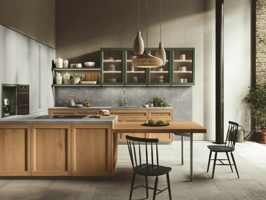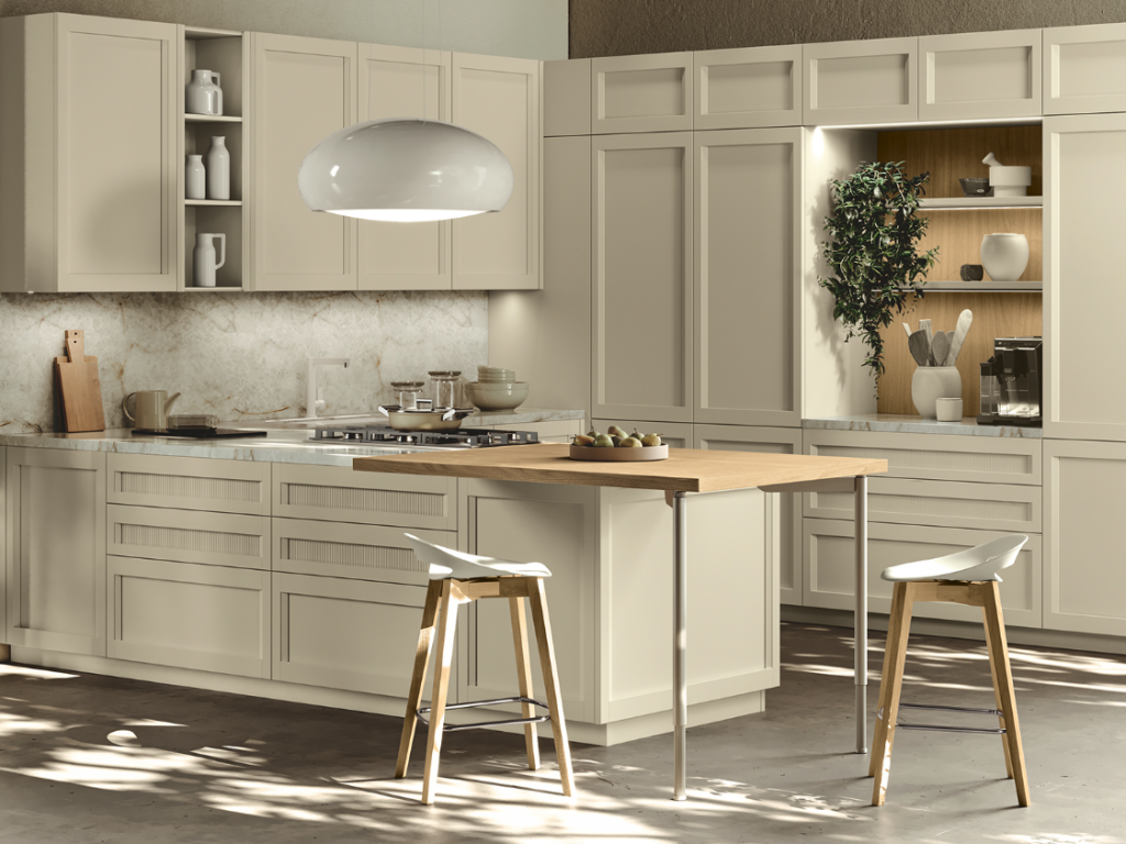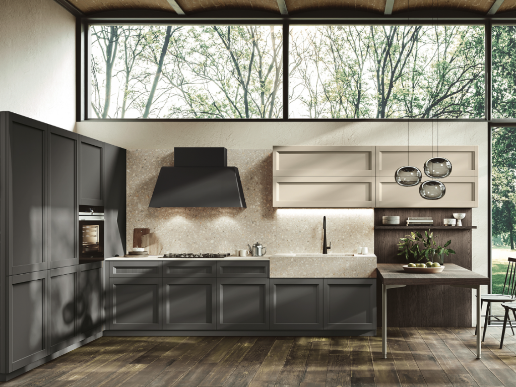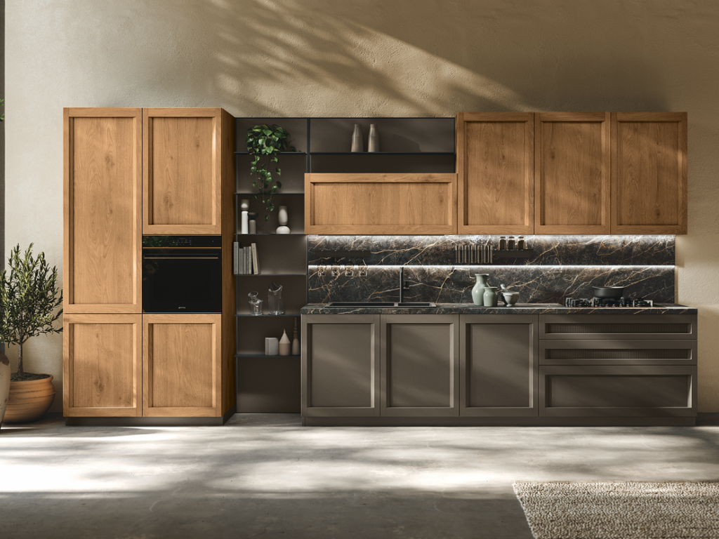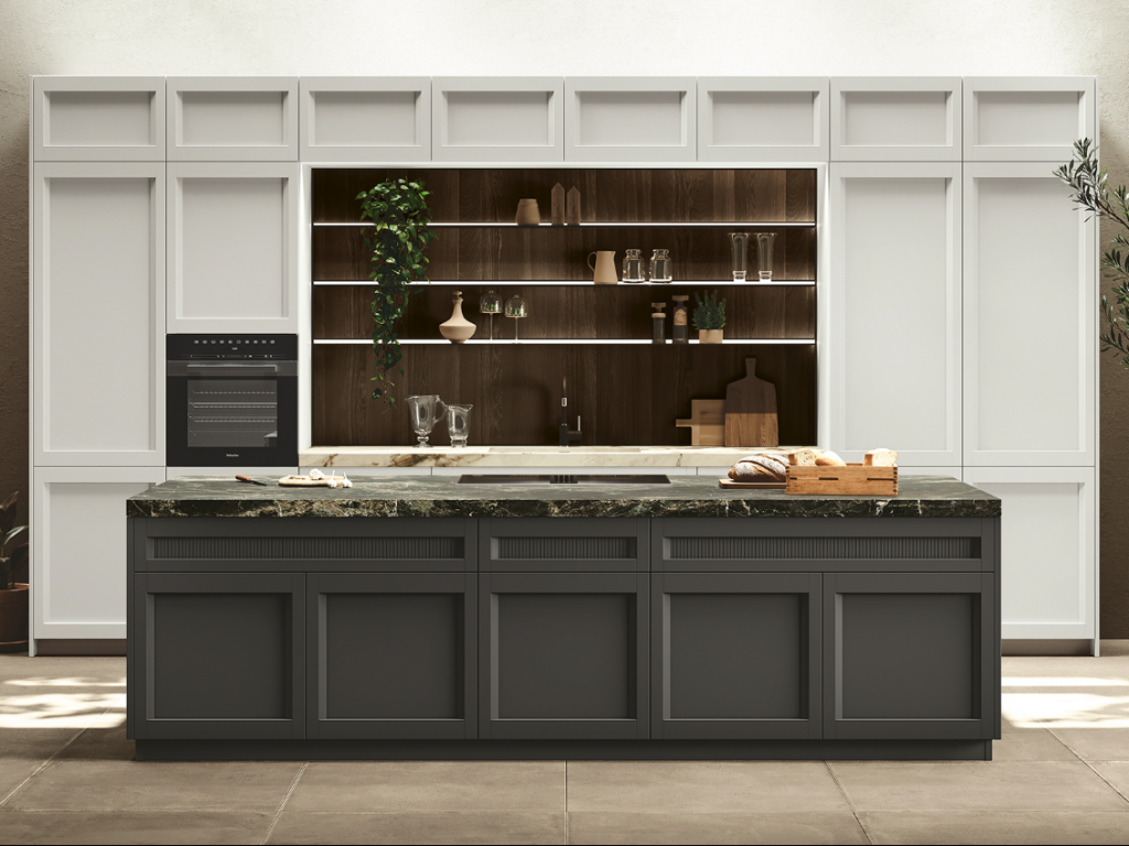 Un ambiente in cui l’eleganza classica sposa la semplicità moderna: una cucina che sfida le convenzioni e abbraccia la bellezza dei contrasti. Le ante a telaio, che ricordano un’epoca passata, si intrecciano con grazia a quelle rigorose e squadrate, creando un accattivante gioco visivo. È più di uno spazio di lavoro; è un luogo dove si formano connessioni, dove vengono creati ricordi preziosi attorno ad un tavolo conviviale.