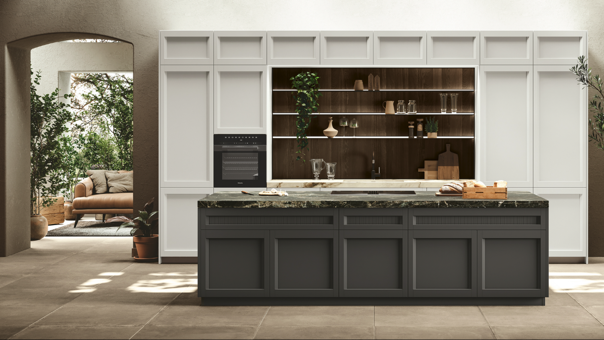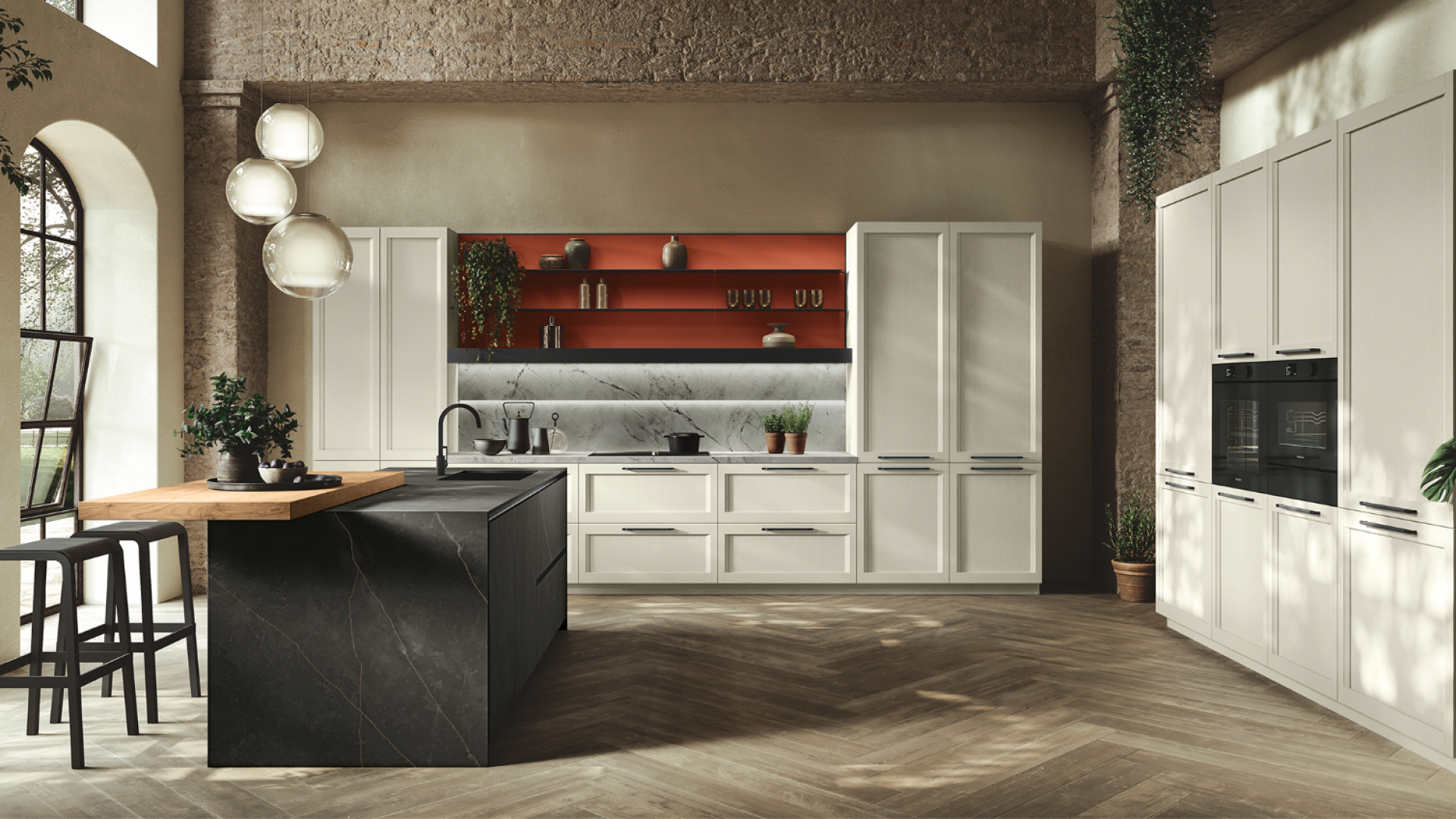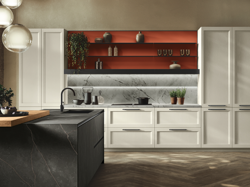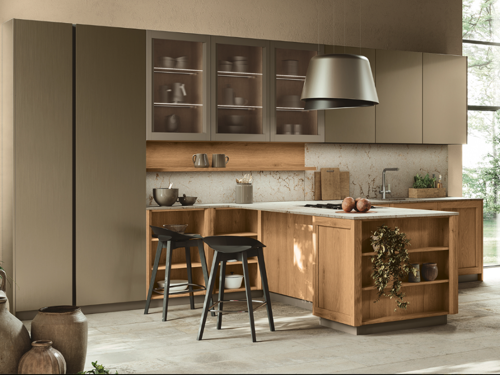 Un ambiente in cui l’eleganza classica sposa la semplicità moderna: una cucina che sfida le convenzioni e abbraccia la bellezza dei contrasti. Le ante a telaio, che ricordano un’epoca passata, si intrecciano con grazia a quelle rigorose e squadrate, creando un accattivante gioco visivo. È più di uno spazio di lavoro; è un luogo dove si formano connessioni, dove vengono creati ricordi preziosi attorno ad un tavolo conviviale.